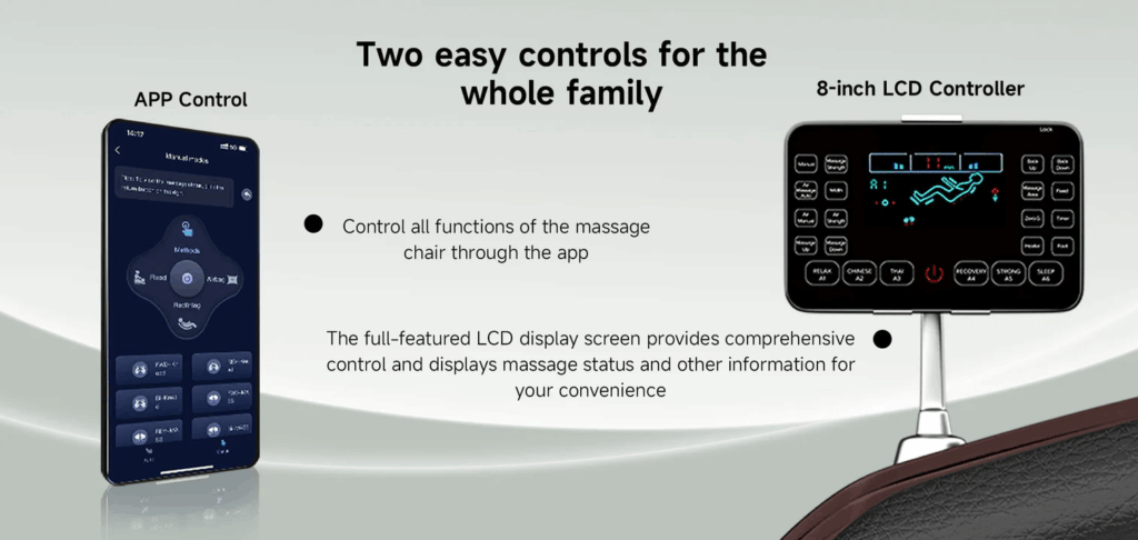 You’ve got two ways to control the chair: an 8-inch LCD touchscreen remote and app control. The touchscreen is super intuitive, and the app gives you full access to all settings right from your phone. Even if you’re not super techy, both options are user-friendly and straightforward.
